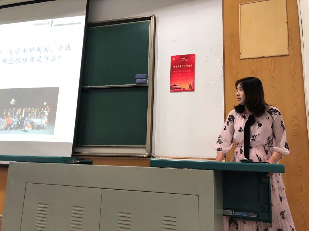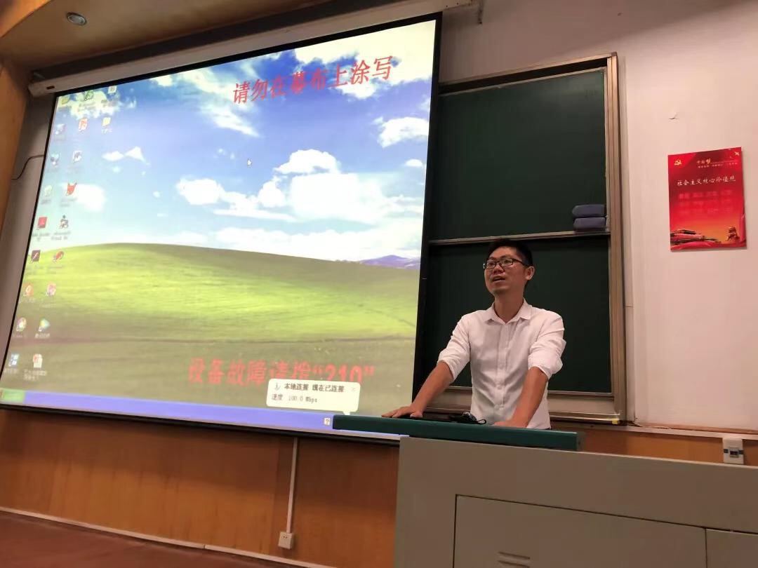 十分钟的休息时间过后,吴思伟老师向同学们介绍了学院的党建工作与党建办工作小组,号召新生们积极向党组织靠拢,不忘初心跟党走。随后郑老师为同学们详细地讲解了集团的奖励资助相关办法。