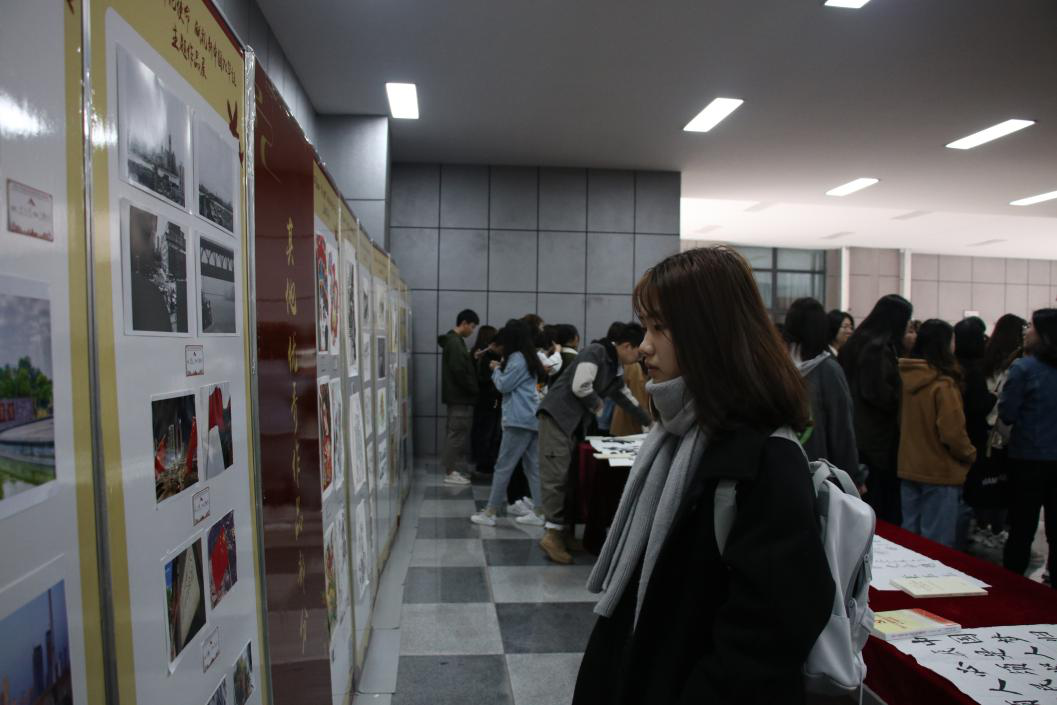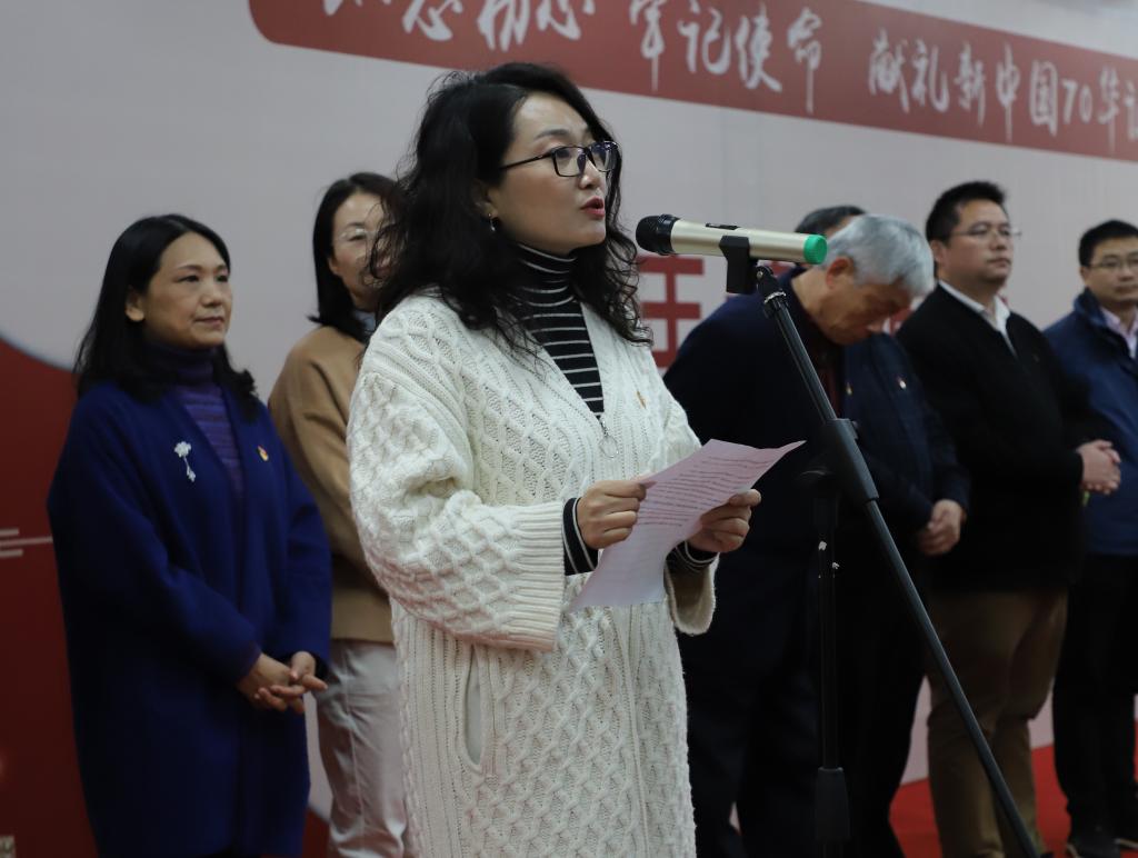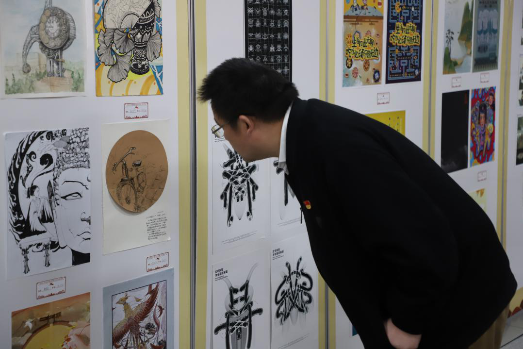 2019级设计学专业本科生杜俊彦代表参展员工发言。杜俊彦用极富文采的语言表达了自身对新中国一路走来历经艰险,取得的辉煌成就的触动,展示了作品的创作意境。最后,杜俊彦对全体员工发出号召:要以“何时缚住苍龙”的决心与勇气,为祖国的明天贡献自己的力量。