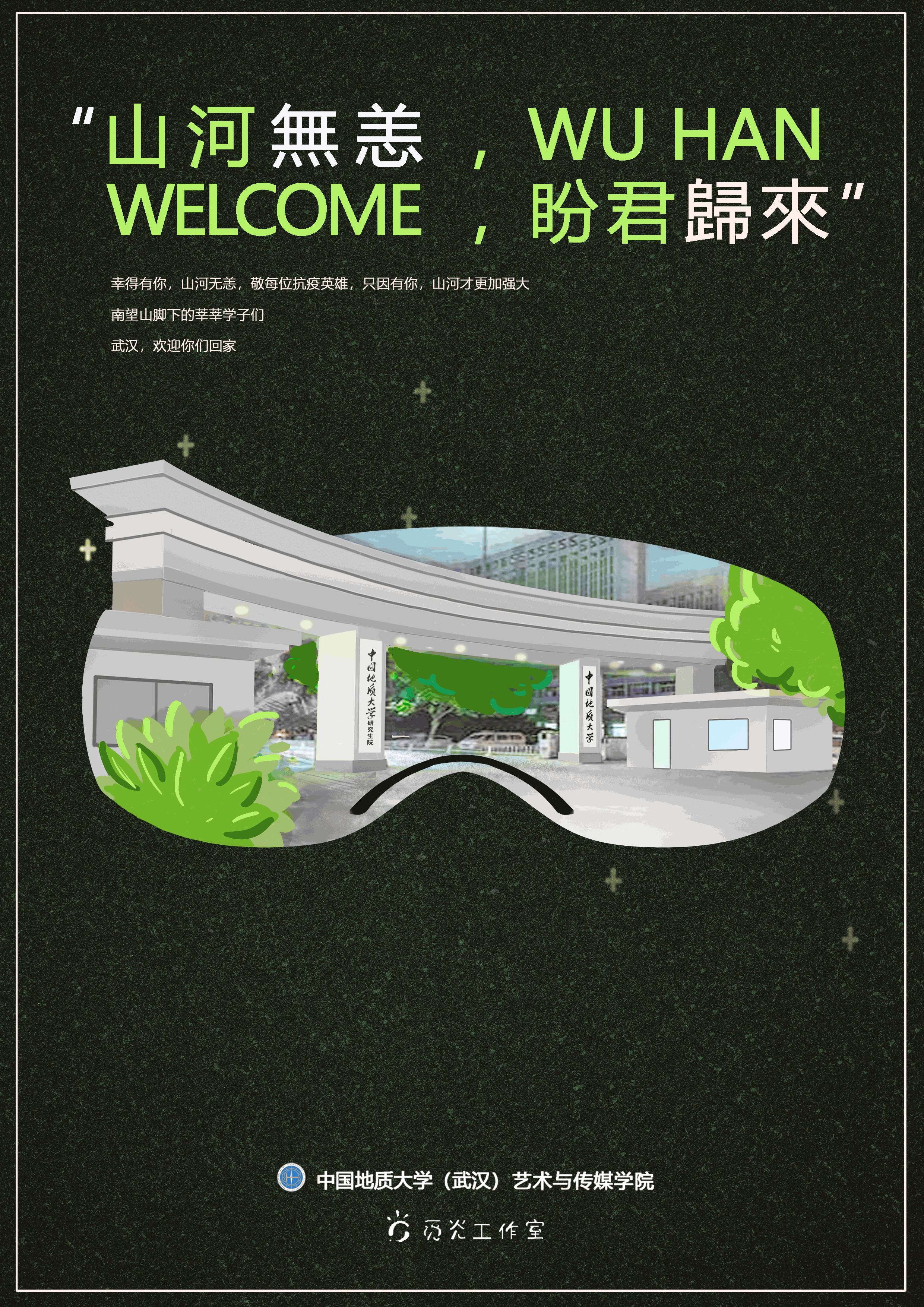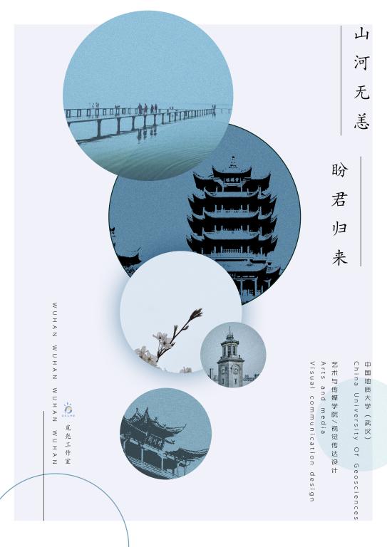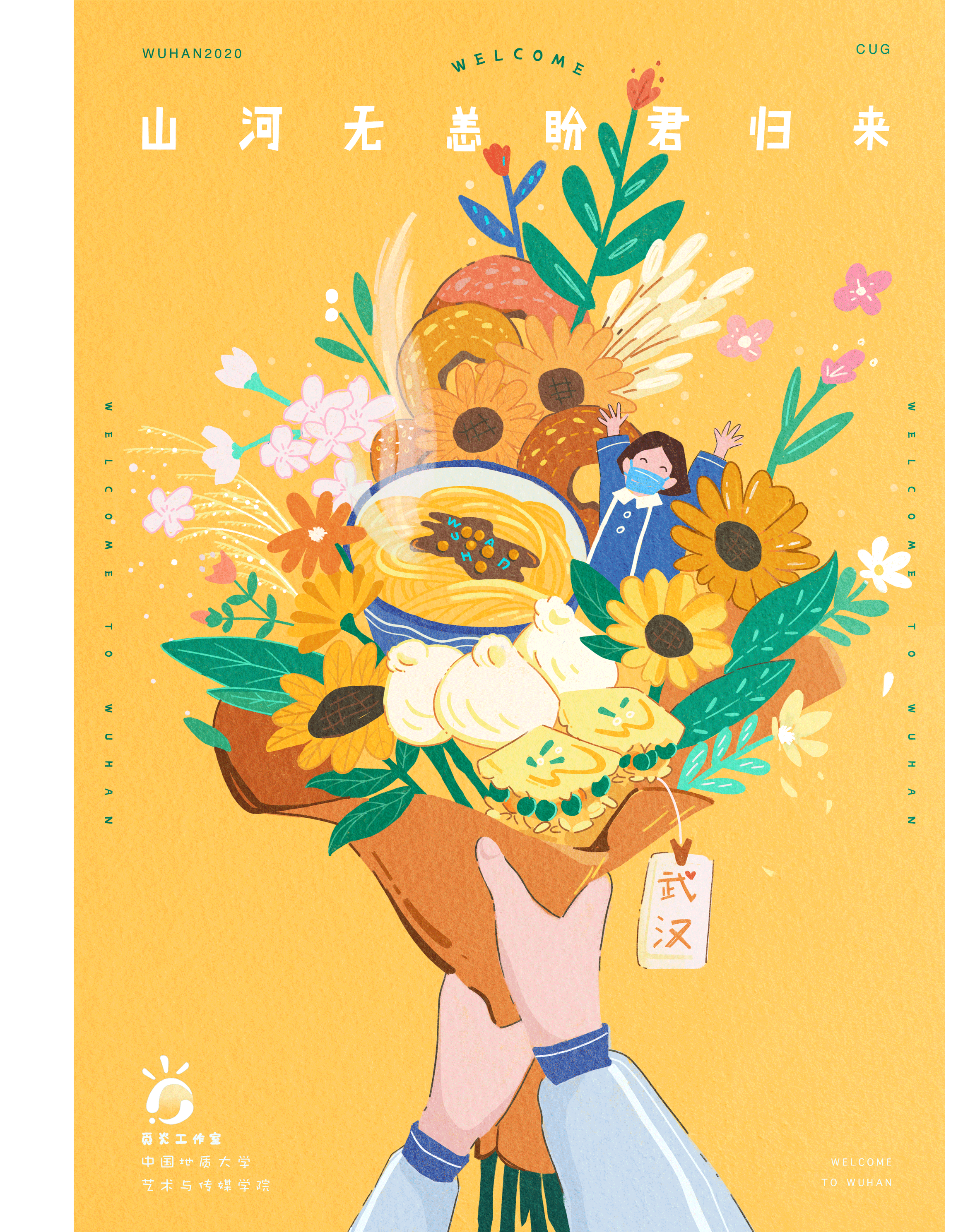 如今,武汉重启,我们即将回到校园,在这个令人激动的时刻,由今年会视觉传达专业徐莉觅灮工作室,以“山河无恙,盼君归来”为主题,设计了系列海报作品,欢迎莘莘学子重回武汉。
