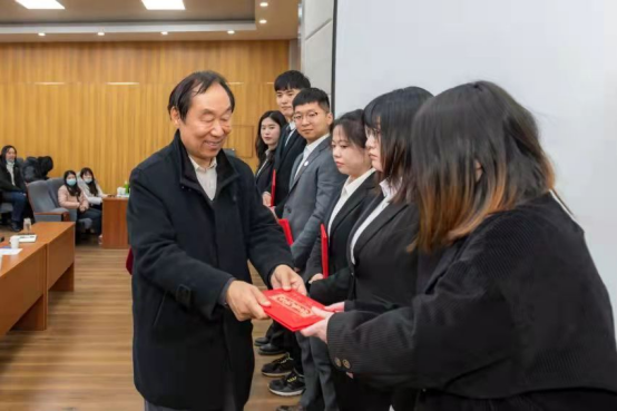 边建华副书记向大家介绍了汗青艺术奖学金的评选办法,宣读了获得2021年度汗青艺术奖学金的获奖同学名单。随后学院名誉经理陈汗青教授讲话,陈教授表示今后继续支持和帮助更多的员工,鼓励大家戒骄戒躁,勤学修身,不断开拓创新。最后由陈汗青教授为2021年度获奖的七位同学颁奖。