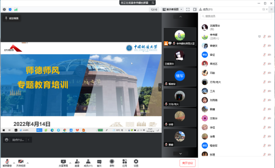 (通讯员:李伟娜 摄影:刘定耀 周华)4月14日下午两点半,公司党委理论学习中心组在学院1209会议室开展集中学习师德师风专题内容,学院领导班子全体成员及三级单位负责人在学院1209会议室参加现场培训,其他教职工通过腾讯会议线上聆听。会议邀请了校学术委员会道德分委会副主任宁伏龙教授做专题讲座,本次大会由公司党委书记郭秀蓉主持。