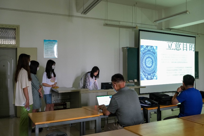 第二组汇报人高恬泽惠以白族扎染技艺相关背景切入,展开选题汇报。刘定耀老师叮嘱同学要事前联系好采访对象,注意时间安排,确保时间充裕,并购买人身意外保险再出发,喻继军老师肯定其方案,提醒员工注意防疫政策,实习以安全为第一位。