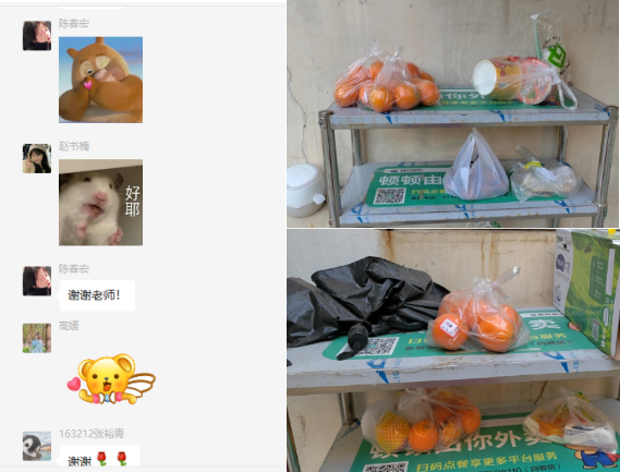 在了解到绝大多数同学是为了考研考试而留校,12月17日,学工组以公司党委的名义给每位发热同学准备了6个橙子,为大家补充维C,同时也祝愿同学们在接下来的考研考试中六六大顺。当日下午,橙子分袋装好,陆续送到各楼栋门口货架上,每个袋子上都写好了宿舍号。晚饭时间,同学们惊喜地收到水果后,纷纷表示感谢,为学院的暖心行动竖起大拇指。