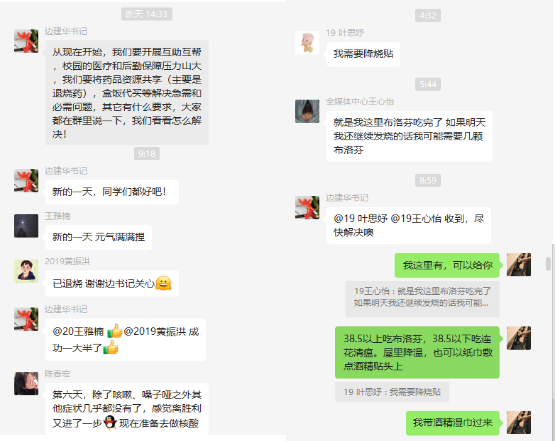 了解到还有36名本科生和25名研究生存在相关症状后,边书记第一时间关心同学们的吃饭、用药及高烧期间的安全问题。后续果然有员工突发高烧需要药品,联系群迅速起到了作用,退烧药和酒精贴及时送到了员工手上,同时,也有更多同学在群里发布自己恢复的喜讯,提供多余药物,更新药店信息,介绍发烧经历,安抚躁动情绪。