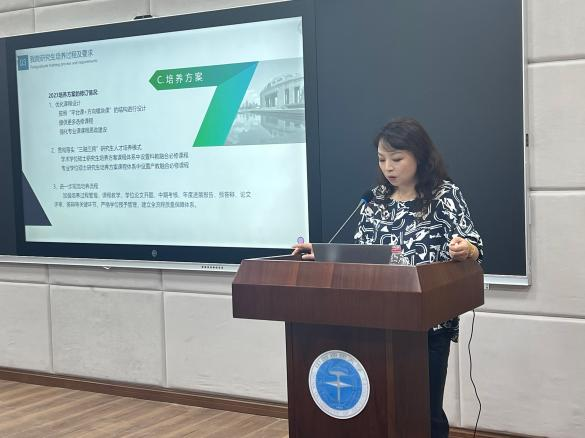 会议第二场,由副经理彭静和研究生教学秘书喻硕作公司产品方案和研究生管理制度讲解、学风和学术道德教育。彭经理从团队建设、人才培养、学位管理、学术规范四个方面对研究生教育工作作系统讲解,并向同学们介绍了“三融三跨”的公司产品新模式。在最后,彭经理寄语2023级新生要坚持热爱本专业、拓展眼界和格局,并不断锤炼自身品行,锐意进取,不负青春。